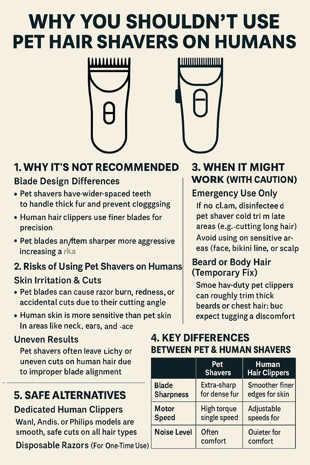 Zatiaľ čo holiace strojčeky pre domáce zvieratá A výstrižky z ľudských vlasov môžu vyzerať podobne, nie sú vzájomne zameniteľné z dôvodu kľúčových návrhov a rozdielov v bezpečí. Tu je podrobné rozdelenie: