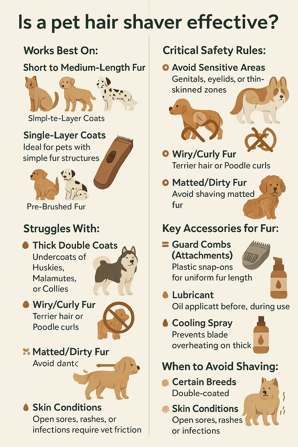 Áno, a holiaci strojčekom pre domáce zvieratá (tiež nazývané strihanie PET alebo zastrihávače) sú špeciálne navrhnuté tak, aby pracovali na zvieratách, ale účinnosť závisí od typu kožušiny, kvality nástroja a techniky. Nižšie je uvedené podrobné rozdelenie:
