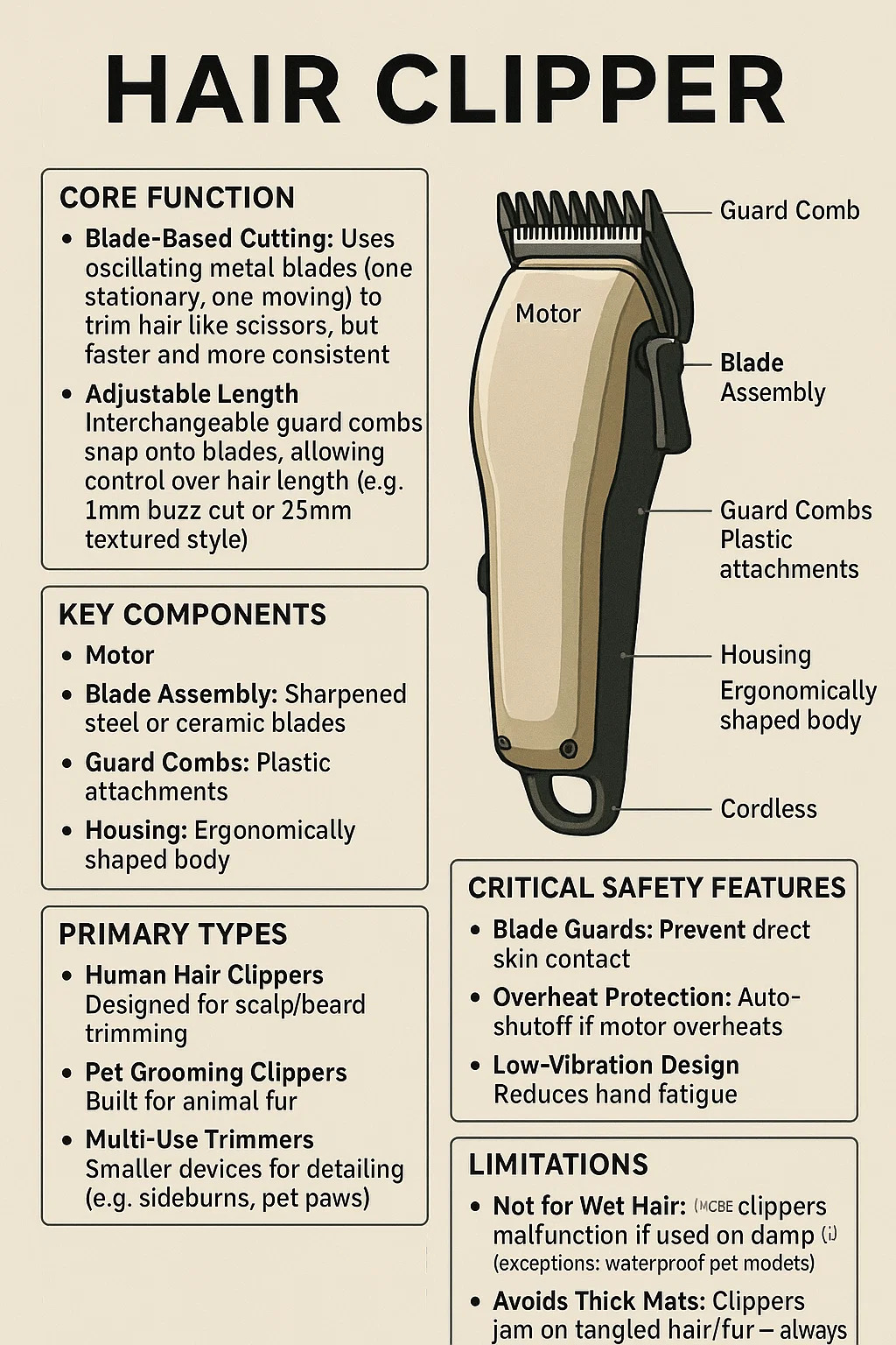 Nie pre mokré vlasy: Väčšina strihoviek poruchy, ak sa používa na vlhké vlasy/kožušinu (výnimky: vodotesné modely domácich zvierat).