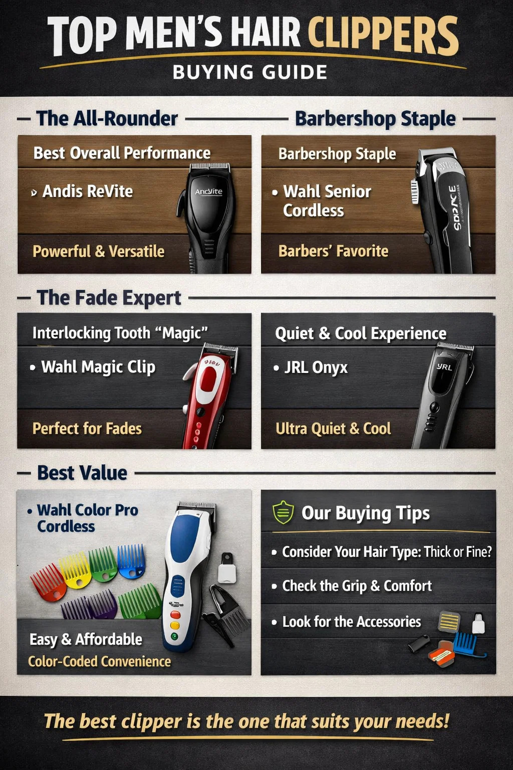 Najlepší celkový výkon (napr. Andis ReVite): Ide o možnosť najvyššej úrovne, ktorá je momentálne na trhu. Dokonale kombinuje výkonný motor profesionálnej kvality s pohodlím domáceho použitia. Nielenže je rýchlosť rezania extrémne vysoká, ale čepele sú tiež ľahko odnímateľné pre čistenie, čo umožňuje aj začiatočníkom zažiť špičkový pocit.